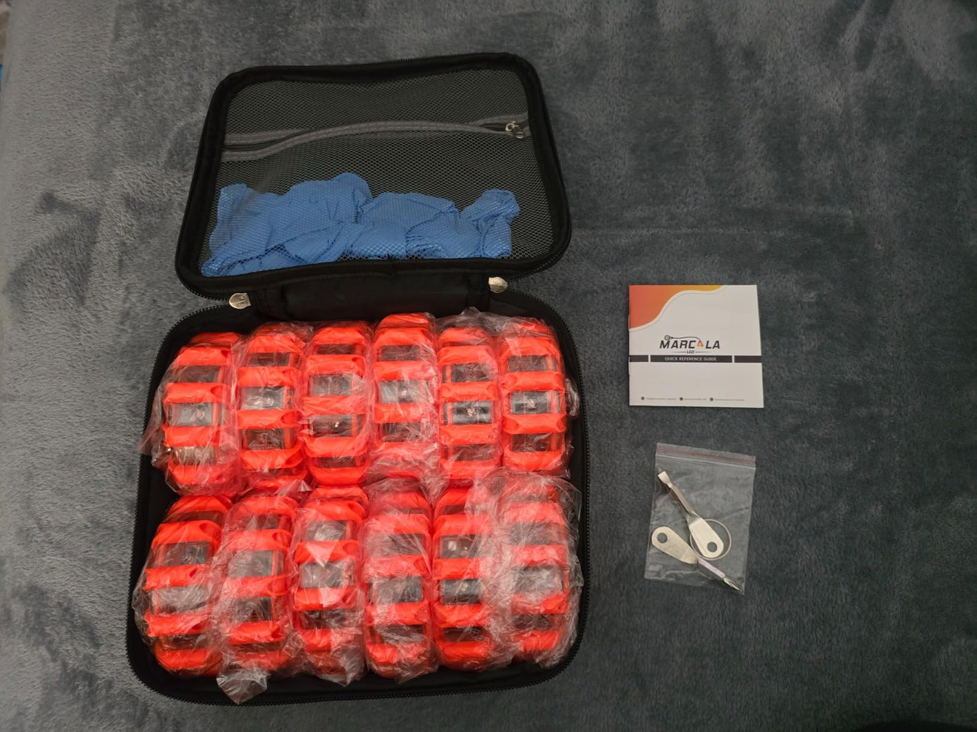 El kit incluye 6 luces LED, 18 baterías preinstaladas, una multiherramienta, un cortador de cinturones de seguridad, un silbato y un estuche compacto, asegurando que estés totalmente equipado para cualquier situación imprevista.